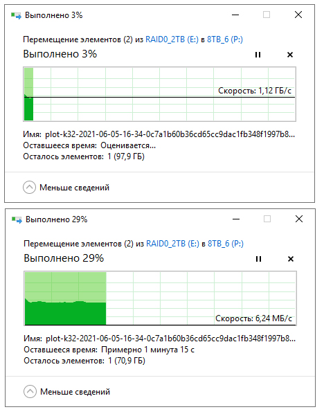 Всем привет сервер на supermicro x10dri два проца 2780v3, 64гб оперы.Ось - WS2019. Контроллер - Adaptec 71605/lsi9286-cv/lsi9271-8i/rocketraid 2720 ... суть не меняется ... при копировании больших файлов на диск - скорость падает до 0-10 мб/с.