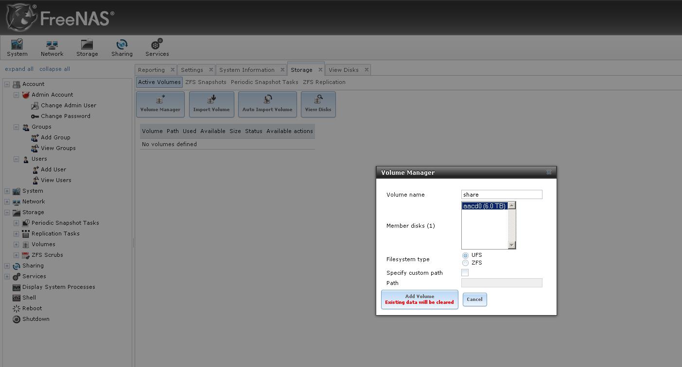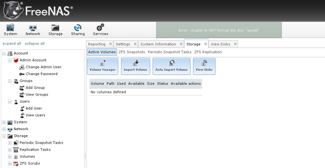 Необходимо настроить хранилище на Freenas. Используется RAID контроллер adaptec 5805. На нем построил RAID 10. (состоит из 6 дисков по 2Тб, во общем после настройки получилось 6 Тб). И еще отдельно подключен HDD для Freenas. Установил на отдельный HDD Freenas 8.3 x64. Все установилось успешно, по DHCP получил IP адрес. Захожу через web интерфейс для дальнейшей настройки. Захожу Хранилище-Управление томами-В списке дисков выбираю aacd0(6Тб). Выбираю тип файловой системы UFS. Нажимаю добавить том. После чего он выдает ошибку Unable to GPT format the disk "aacd0". (скриншоты во вложении 3,4)