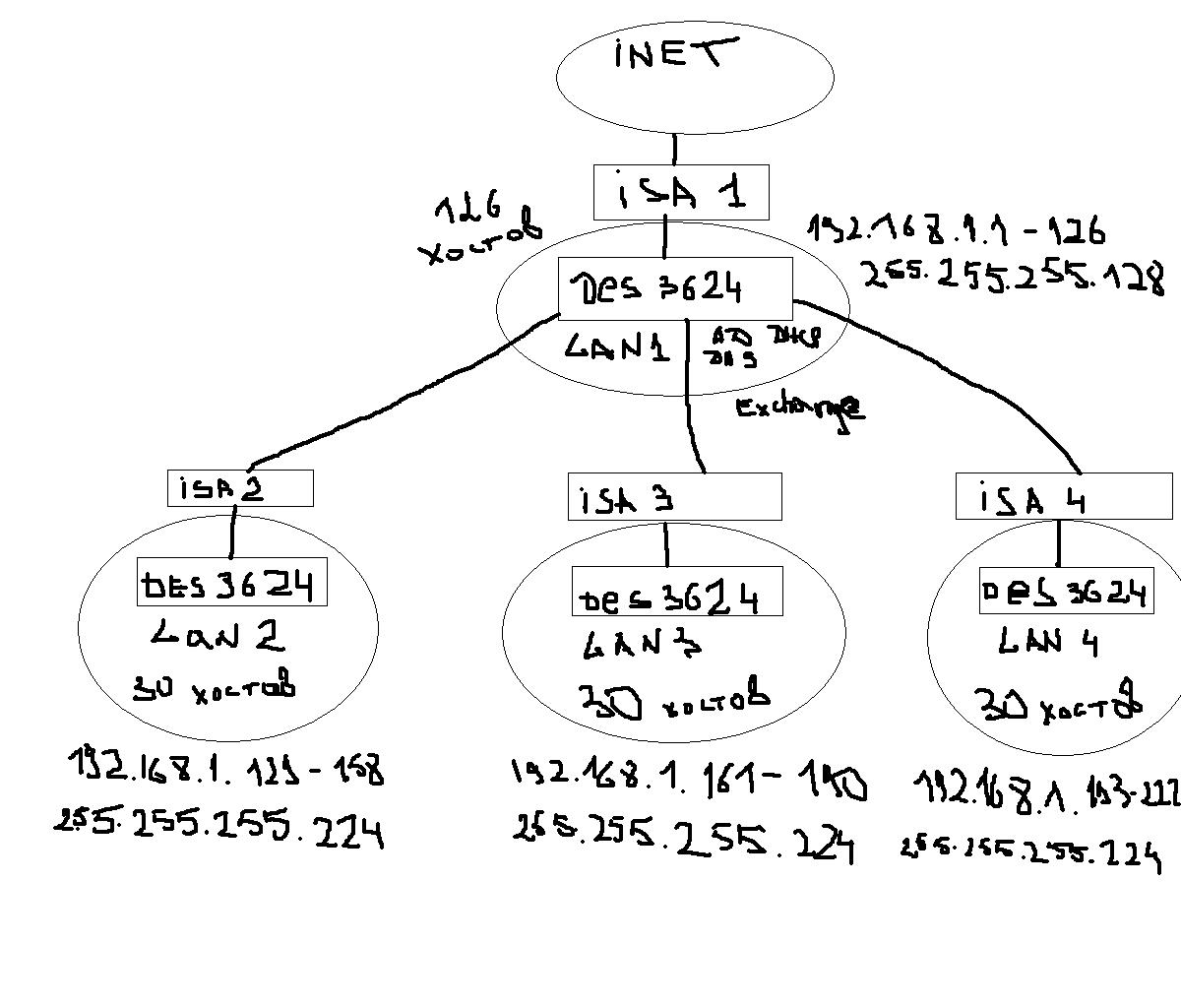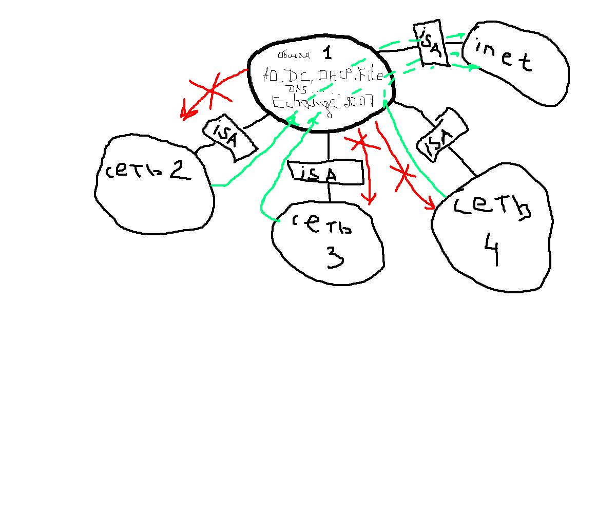 И 4 общая сеть где располагается сервера с AD, DNS, DHCP, File Servers, Date base servers, Exchange 2007, Isa 2006.