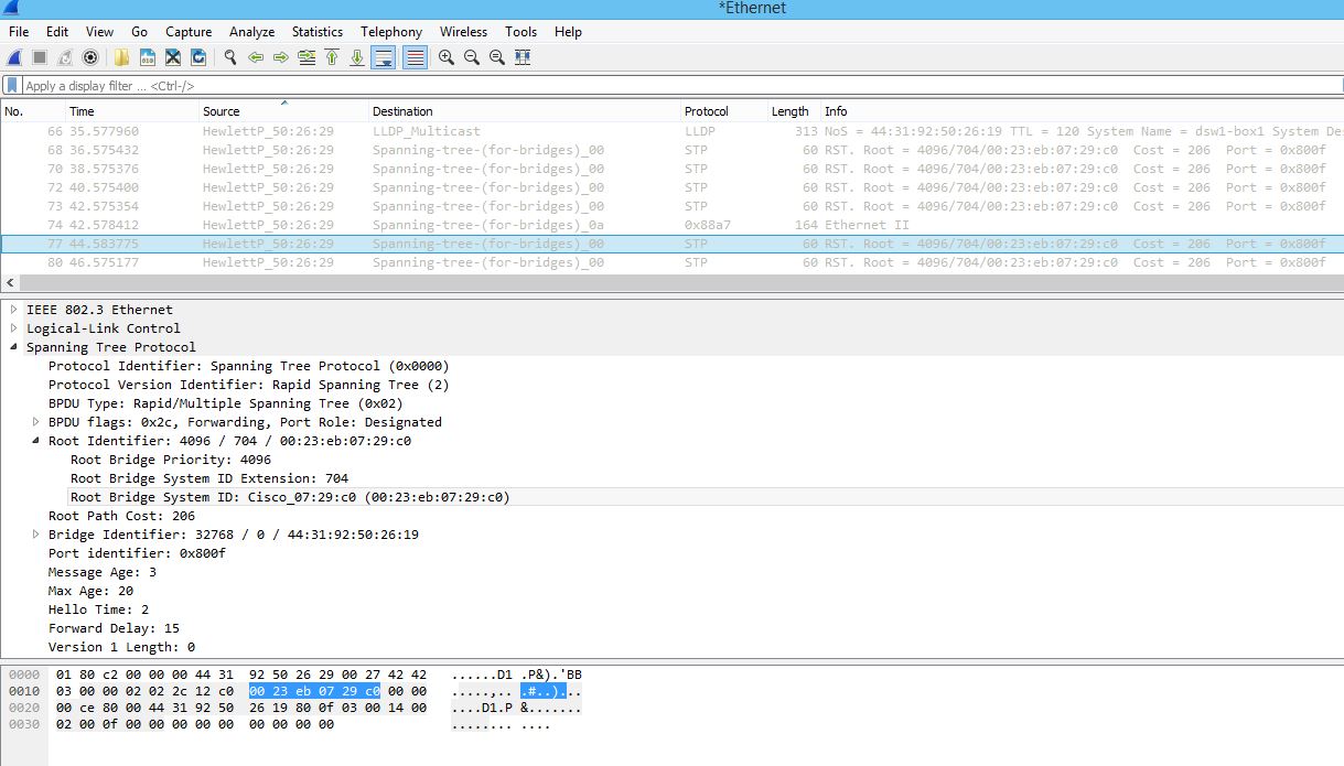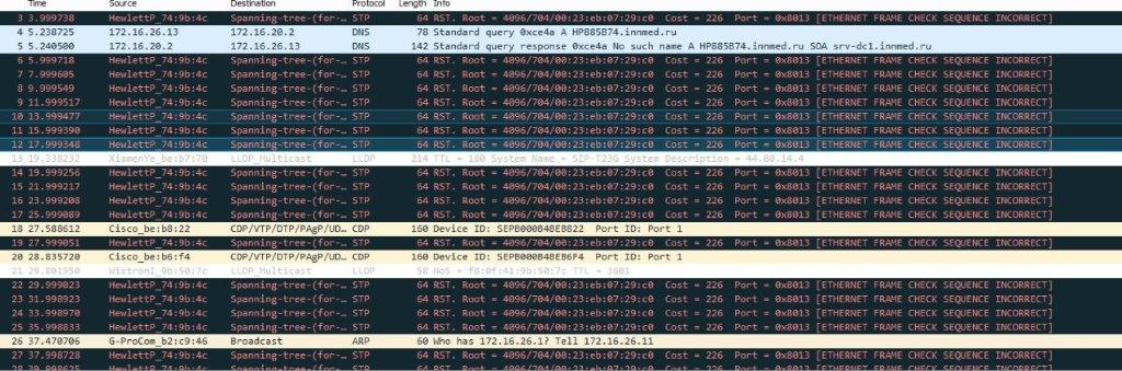 Что уже пытались делать: искали флудящие источники рассылающие широковещательные пакеты. Некоторых нашли, отключили, но не помогло. Поделили 4 изначальных влана до 6, т.е. из одного основного с пользователями сделали еще 2 дополнительных. Тоже не помогло. Программно (без отключения питания) ребутали все коммутаторы. Решало проблему максимум на день. Проверили на все возможные петли. Пока снифил Wirshark-ом сеть обнаружил в сети ходящие пакеты STP. На свое удивление обнаружил, что по умолчанию на коммутаторах 1920 и 1910 был поднят RTSP. Посмотрев содержание пакетов выяснилось, что для моей сети Root-м была выбрана устройство Cisco, которого у нас нет и она принадлежит БЦ через оборудование которого мы подключены в ЦОД. Далее, вчера обнаружил у себя только на коммутаторах доступа HP-1910 странные пакеты с STP ругающиеся на контрольную сумму. Беседы с ИТ-никами БЦ пока ничего не дали и я на это время вообще отрубил STP. После отключения STP подобных пакетов не стало, но координально пока не помогло. Сегодня опять появлялись пользователи с теми же проблемами. Появление проблем стало отмечаться примерно после реорганизации сети, когда у нас появился HP-2530. В данном случае очень странно как он мог бы повлиять.