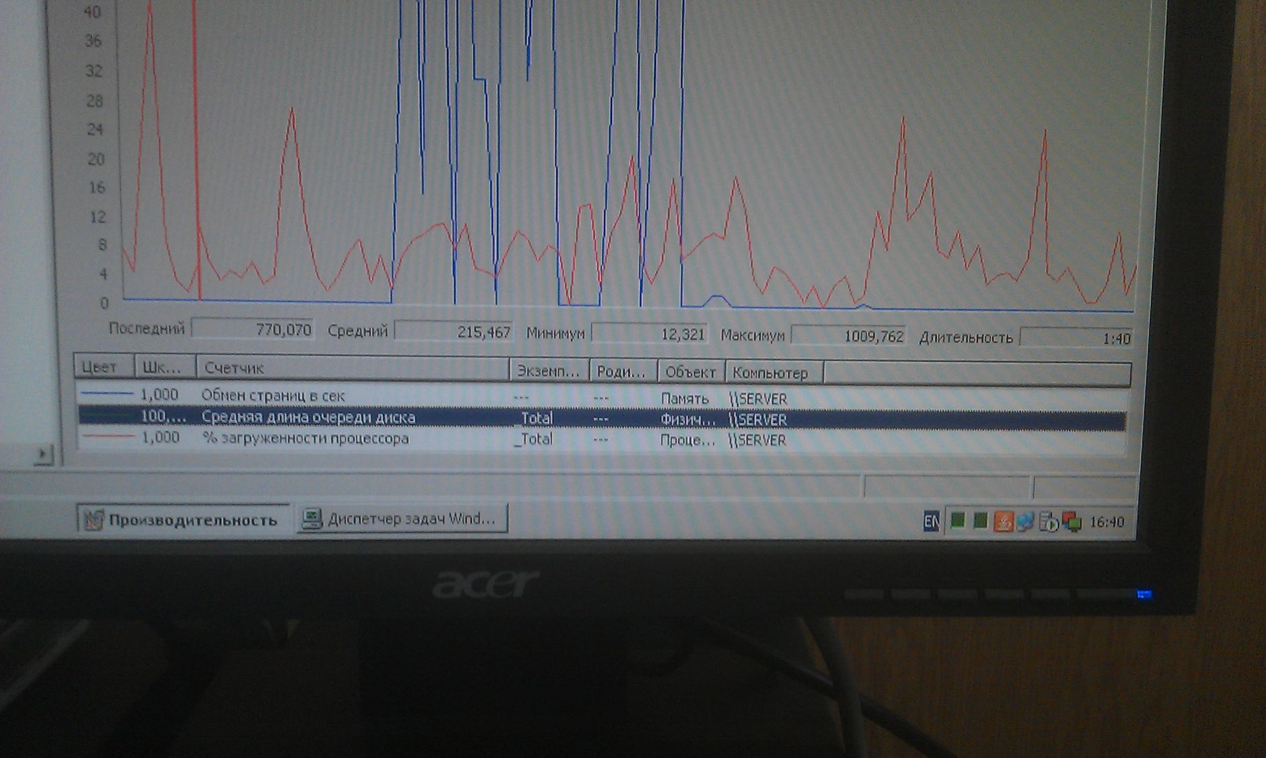 Просто когда началась загрузка отчетов, полоска очереди поднялась максимально вверх и больше не спускалась.Stranger03 писал(а):На картинке почти ничего не видно кроме пиков. Нужен бинарник. На 15-ть человек в терминалку вполне можно поставить серверок с одним Е3 почастотнее. А старичка отдать под другие задачи.mark4s писал(а):PS счетчики perfmon выложу вечером.