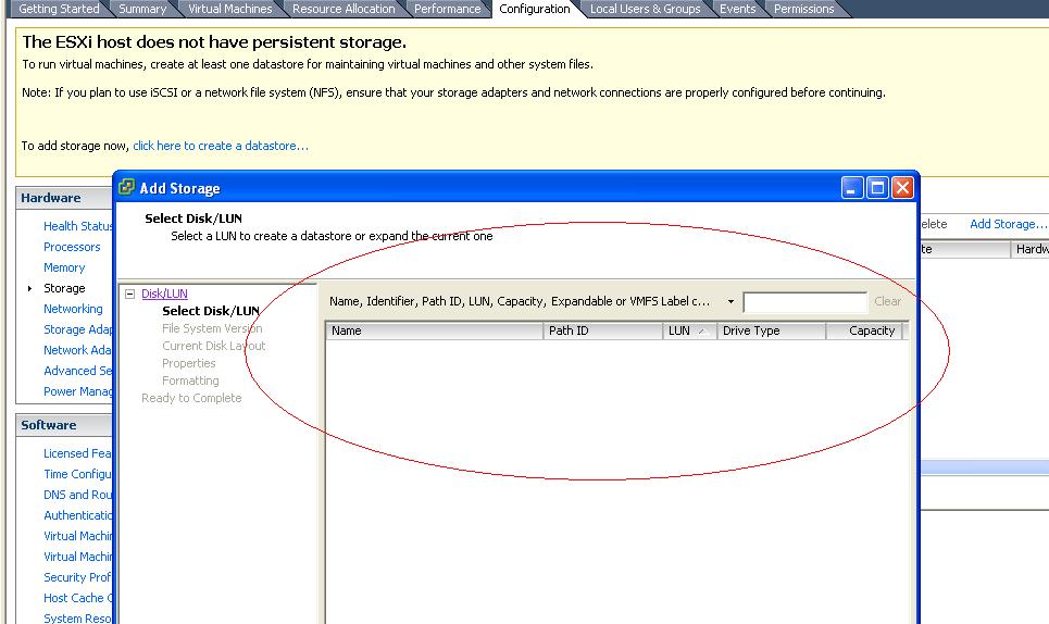 Получил ситуацию на картинках: контроллер esxi виден, а массив на нем нет.
