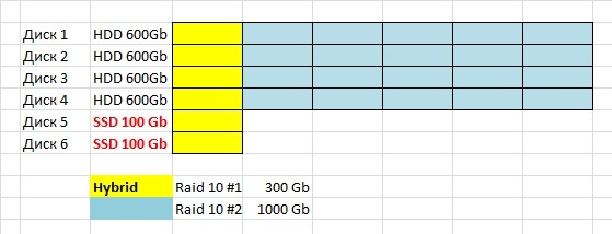 1x Hybrid RAID 10 на 6-ти дисках (2 SSD + 4 HDD) 300 Gb