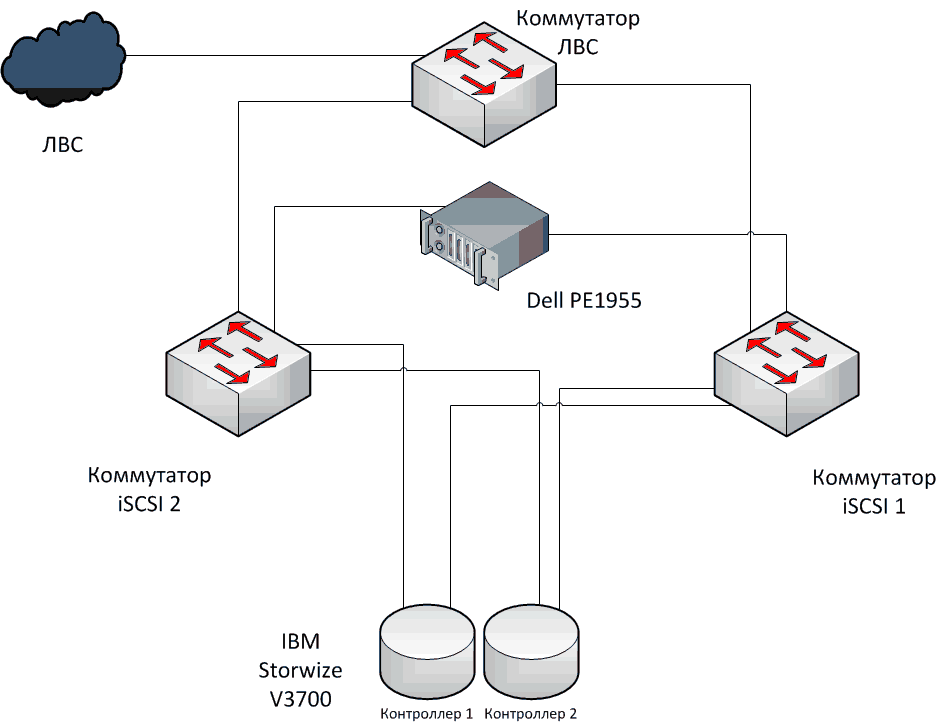 Зачем ставить отдельные айскази коммутаторы? Включаете в общую сеть, на хостах ставите мпио драйвера, подключаете тома и все.maverlife писал(а):Во вложении схема подключения, как я себе представляю ее.
