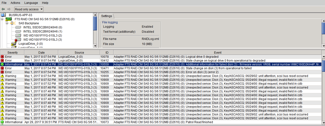 Тот же RAID-контроллер Fujitsu D2616 . На этот раз ошибка после броска напряжения на SSD диске Intel 240G SATA.
