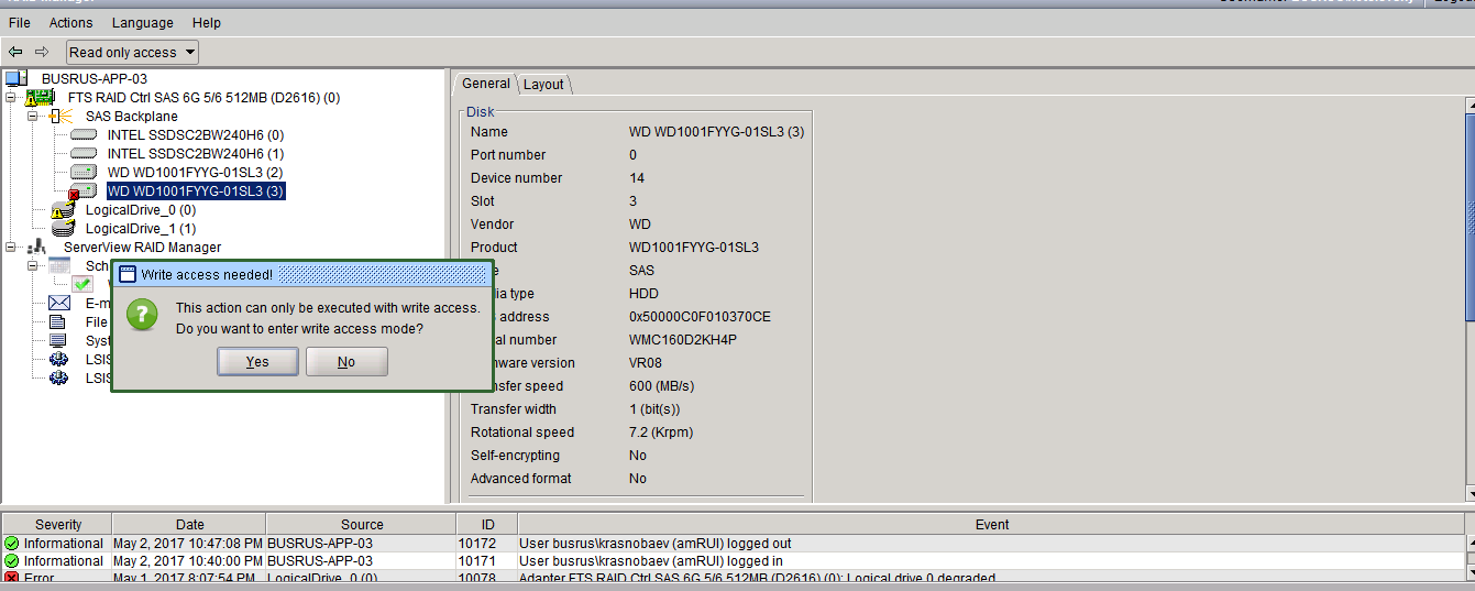 Кстати, на любое действие (даже Locate) контроллер просит перейти в режим Write. Я так понимаю, что Read-only и Write относятся к памяти контроллера, а не к дискам в RAID'ах? Глупый вопрос, но чисто для уверенности: все действия производятся в режме Write и на работающем сервере? (а то руки слегка дрожат)Umlyaut писал(а):главное, не дёрнуть годный диск (впрочем, внимательность не помешает и после отработки пп.1-2);