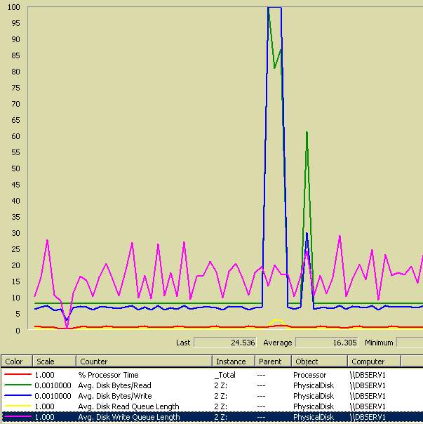 Про очередь: понимаете, значения Avg.queue length суть значения вычисляемые (число запросов в сек * время исполнения запроса). Но величины эти имеют какое-либо осмысленное значение только тогда, когда значения current queue length в начале и конце переода измерения совпадают (т.е. когда соблюдается состояние равновесия) (см. закон Литтла и теорию очередей). Поэтому параллельно с наблюдением avg.queue length имеет смысл мониторить current queue length - моментальные значения длины очереди. В этом случае (опять же, в зависимости от нагрузки и длины изучаемого интервала времени, который на время измерения имеет смысл делать минимальным) можно как-то использовать полученные числа.
