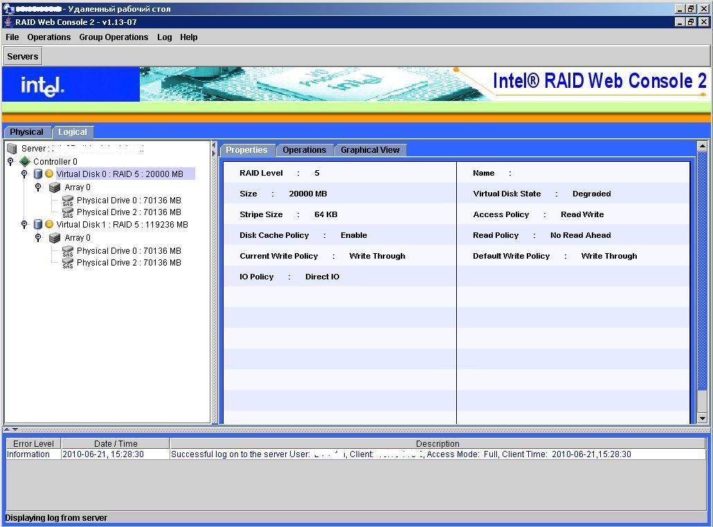 Смонтирован RAID5 (далее разбит на два логических диска). Проблема: судя по консоли, два винта перешли в состояние Unconfigured&Bad. Система продолжает работать.