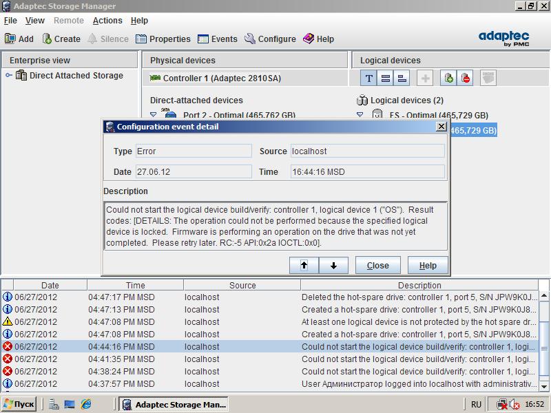 Здравствуйте. Помогите с контроллером Adaptec 2810, не могу создать ни RAID 1 ни Raid 10. Жесткие диски Hitachi 500 GB HUA722050CLA330. Создавал массив методом build\veryfy висло на 27 процентах из acu, в asm создавался но при попытке verify with fix писал specified logical device is locked. Методом clear создался, но перешел в статус impacted. До этого пробовал с дисками Samsung (Seagete) 1ТБ ST1000DM005, массив не создавался вообще, а контроллер выкидывал ошибку ядра. Подскажите как быть с контроллером