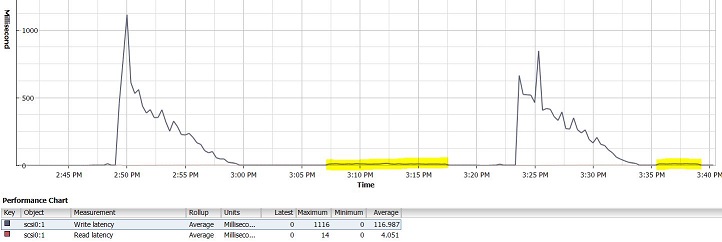 На скриншоте - 2 пика есть результат 2 запусков IOmeter на раздных vdisk, желтым отмечен результат повторного запуска, видно, что система кэширует запросы.