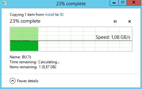 Реальная скорость при копировании robocopy, с диска на диск файл 13гб, - 250мб/сек.