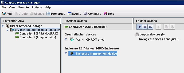 Победил-таки Adaptec Storage Manager сегодня ночью. Вобщем безрезультатно бился я с версией 6.10.0.17546, так как она изначально стояла и массив видела (возможно потому, что драйвер Adaptec SATA AHCI был не такой как сейчас, а старее 1.5.17712.0), а ASM версии 6.10.0.18771 не пытался ставить, так как помнил, что он у меня массивы не видел. Останавливал службу Брандмауера, отключал антивирус, при переустановке ASM останавливал службу ASM, обновил драйвер еще у одного устройства Adaptec Host RAID Managemet Device до той же версии, как у Adaptec SATA Host RAID. Танцевал с бубном, смотрел конфиги и XML-файлы ASM, ковырялся с утилитой Arcconfig. Массивов и дисков нет, есть только DVD-привод. Потом снес ASM 6.10.0.17546 и поставил 6.10.0.18771 - вуаля и все массивы и диски на месте. Скриншот прилагается.