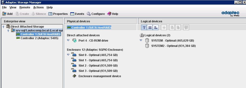 Решил делать более длительным, но надежным способом: через промежуточный Hot-spare диск с ребилдом на него, потом на новый диск. Удалил новый массив, добавил один диск, BIOS контроллера его увидел, а в Windows он не определился. Пробовал делать обновление конфигурации в Диспетчере устройств Windows – не видел. Пробовал по всякому - никак. Пробовал нагорячую ставить, тоже никак. Аналогично система не видела новый массив, хотя в BIOS контроллера он был. Поставил самую последнюю версию Adaptec Storage Manager (v. 7.31.18856) для контроллера Adaptec 5405 с сайта Adaptec - не увидел теперь даже старого массива. Начал искать драйвера и утилиты на сайте Kraftway - снято с поддержки, ничего нет. На сайте Supermicro с драйверами тоже сложно, нашел промежуточную версию Adaptec Strorage Manager (6.10.0.18771), последний, который еще поддерживает мои драйверы (ftp://ftp.supermicro.com/driver/Adaptec ... Readme.txt) . Поставил - видит уже какой-то «левый» массив с некорректным размером (что-то около 3 ГБ или 10 ГБ не помню уже). Снес, поставил первоначальный (6.10.0.17546). Старый массив увидел, новый нет. Стал искать обновление драйверов дискового контроллера Adaptec AHCI, нашел на FTP Supermicro версию драйвера новее (1.5.17725.3, был 1.5.17712.0), поставил. Теперь ASM увидел новый диск (Hot Spare), но не увидел старый массив и его диски. В Windows диска пока нет, так как Hotspare. Добавил еще один диск. Он появился в Windows и в ASM, старого массива по прежнему нет в ASM. В Биосе контроллера удалил Hotspare и создал опять массив. Теперь в Windows два массива. Вставил вместо пустых дисков диски, которые были в массиве, куда я клонировал систему. Система со старого массива запустилась, оба раздела с разделами вижу, в ASM не видно ни старого, ни нового разделов теперь. Пробовал различные варианты ASM (удалял старый, перезагружал сервер, ставил новый) с диска драйверов с сайта Adaptec, с сайта Supermicro – ASM разделов не видит, Rescan не помогает. Массив с PCI-E контроллера 5405 видится на любых версиях ASM. Запускал утилиту Arcconf.exe, она видит только котнроллер 5405, причем ID у него 1, а в ASM ID = 2 (контроллер 2).