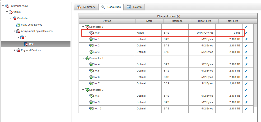 Ситуация: надолго выключали свет, бесперебойников не хватило, сервер выключился, после включения отвалился один диск из массива, казалось бы, ситуация вполне штатная и рейд должен запуститься. Но нет, рейд системой сейчас не детектится, а утилиты мониторинга arcconf и веб-интерфейс storage manager сообщают о каком-то странном статусе рейда "Drive Improperly Connected", что это значит? Я такое впервые вижу.