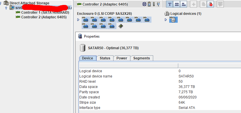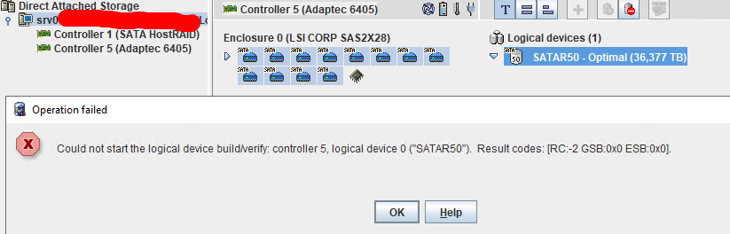 Есть сервер SuperMicro, модель лень выяснять, материнка X8DTH-6F, 2 юнита, 12 дисков 3,5" подключены к внешнему контроллеру Adaptec 6405 через бэкплейн/экспандер. Решили сделать из него хранилище, чтоб не тратить дисковые слоты под ОС, прикрутили два SSD к дефлектору внутри корпуса, подключили к материнке. В 12 слотов воткнули диски SATA по 4Тб, собрали RAID50. Включили в BIOS SATA RAID (Codebase Intel), собрали RAID 1 из SSD. Начали ставить систему (Windows Server) - ни в какую не ставится, видит RAID, но говорит, не могу установить на это устройство, возможно, он не включен в BIOS. Долго мучились, играли с настройками, в результате плюнули, переключили RAID в BIOS на Codebase Adaptec (опознается как HostRAID 5081). Собрали заново RAID1, система поставилась, увидела оба контроллера, вроде все в шоколаде. Но осталась маленькая ложка дегтя - управление этим зоопарком. Сначала поставил maxView Storage Manager 2.05 - он видит только внешний контроллер (6405). Снес его, поставил Adaptec Storage Manager 7.31 - он видит оба контроллера, но управляет только встроенным (HostRAID), при попытке что-то сделать на 6405 выдает примерно так:-"Could not start the logical device build/verify: Controller 5, logical device 0 ("SATAR50"). Result codes: [RC:-2 GSB:0x0 ESB:0x0]. И еще все время меняет номер контроллера 6405 - от 2 до двузначных чисел. Скриншоты прилагаю.