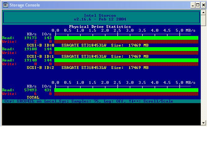 Имеем SCSI RAID SRCU42L, 3 жестких диска Seagate Cheetah 15K.3 18.4 GB модель ST318453LW, LVD терминатор, кабель LVD. Контроллер имеет Интерфейс 64-разрядной/66-MГц шины PCI 2.2, рассчитанный на напряжение 3,3 В и 5 В, обратно совместимый с интерфейсом 32-разрядной/33-MГц шины, стоит на обычной 32-разрядной/33-MГц шине. Все это крутится на MB ECS A780GM-A, CPU 4200+, RAM 2Gb Жесткие подключены к внутреннему интерфейсу (канал B), с обоих концов канала включены терминаторы, на внешний терминатор подается питание с контроллера.