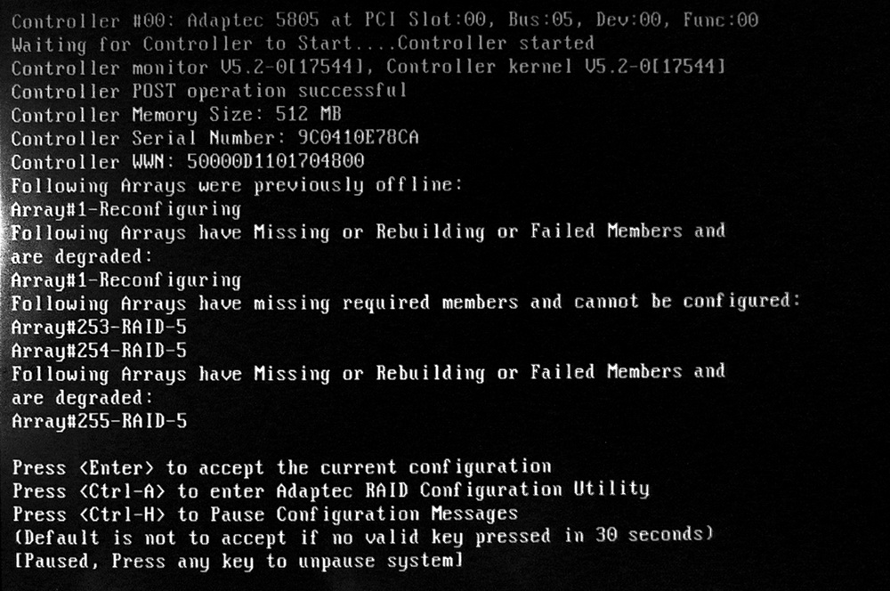 Перезагружаю комп и уже рейд контроллер при инициализации начинает сыпать странные ошибки я НЕ принимал изменений, никаких манипуляций не проводил чтобы хуже не сделать, думал тех поддержка адаптека поможет, а у них там как на зло праздник и до понедельника можно не ждать ответа, а тем временем 4 ТБ данных под вопросом, ОЧЕНЬ важных данных...
