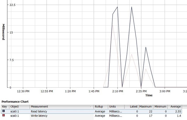 задержка на чтение 22мс, на запись - 10 мс порядка 3300 IOps