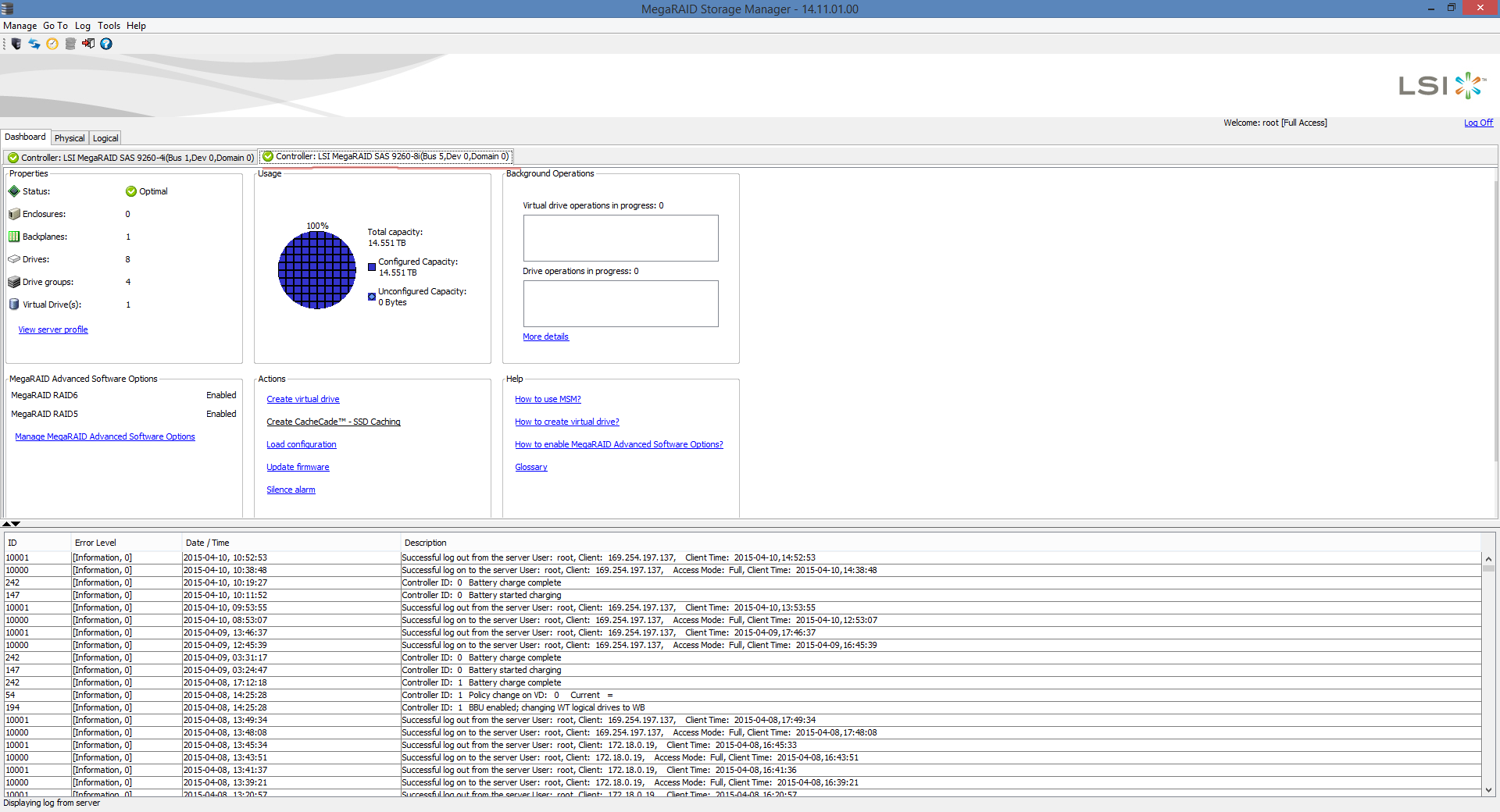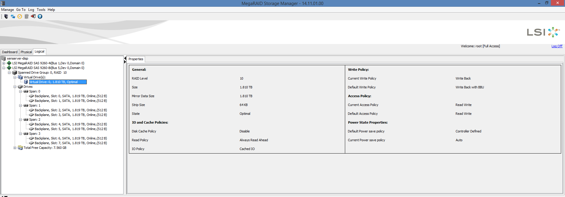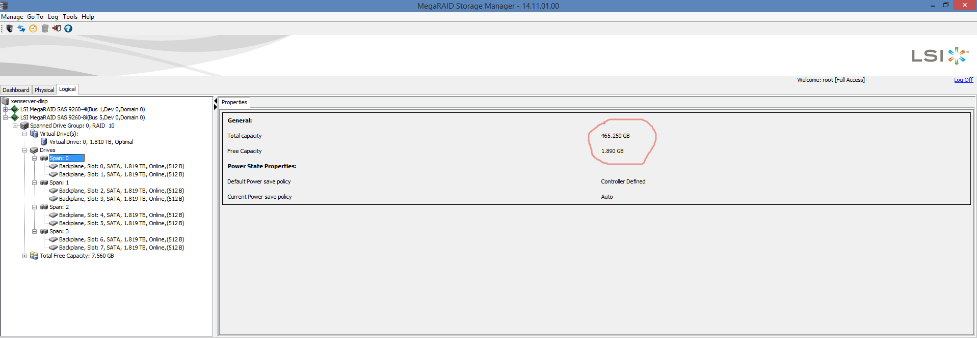 На сервере установлен RAID контроллер LSI 9260-8i