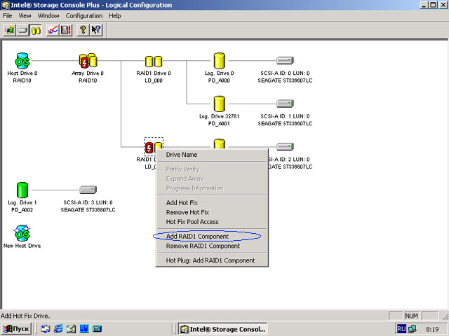 Здравствуйте уважаемые знатоки! Проблема - на контроллере Intel SRCZCR вылетел диск из 10-го рэйда (ST336607LC). Я как умный мальчик заказал новый, но "таких" новых не было, пришлось заказть ST336807LC (думаю, что ничего страшного, должен подойти). Вырубил сервак, вставил новый винт, загрузил винду - тишина... Ребилдом и не пахнет. Перезагружаюсь, захожу в меню рэйд контроллера (о боже! почему я не изучал английский
