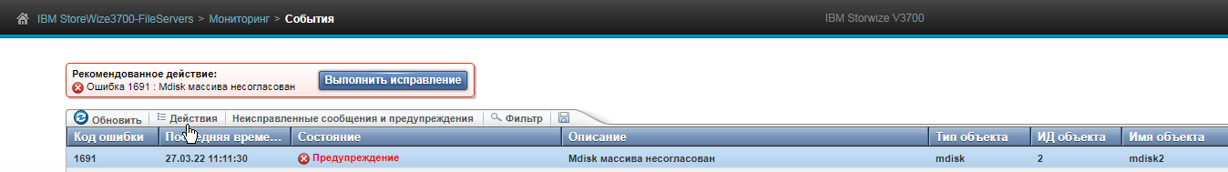 IBM StoreWize 3700 Ошибка 1691 : Mdisk массива несогласован