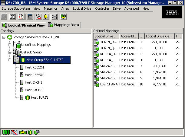 Есть СХД на DS4700, на ней порезаны LUNы. Создана hostgroup для кластера из двух ESXi серверов, для них выделены несколько дисков. Есть физические сервера, которые вынужден включить в ту же хостгруппу, для того что-бы сделать кластер physical-to-virtual. Проблема в том, что на физическом хосте кроме дисков которые ему "следует" видеть, есть диски, которые относятся только к ESX-кластеру, однако "из-под винды" они видны и это опасно, на мой взгляд, ибо можно ненароком их инициализировать. К сожалению, я не нашел способа у IBM Storage Manager 10.1 сделать так, чтобы машинка могла принадлежать разных хостгруппам, и получается, что "все видят все". Хотя я могу сделать так, чтобы диски, которые должны видеть определенные хосты не видела вся хостгруппа.