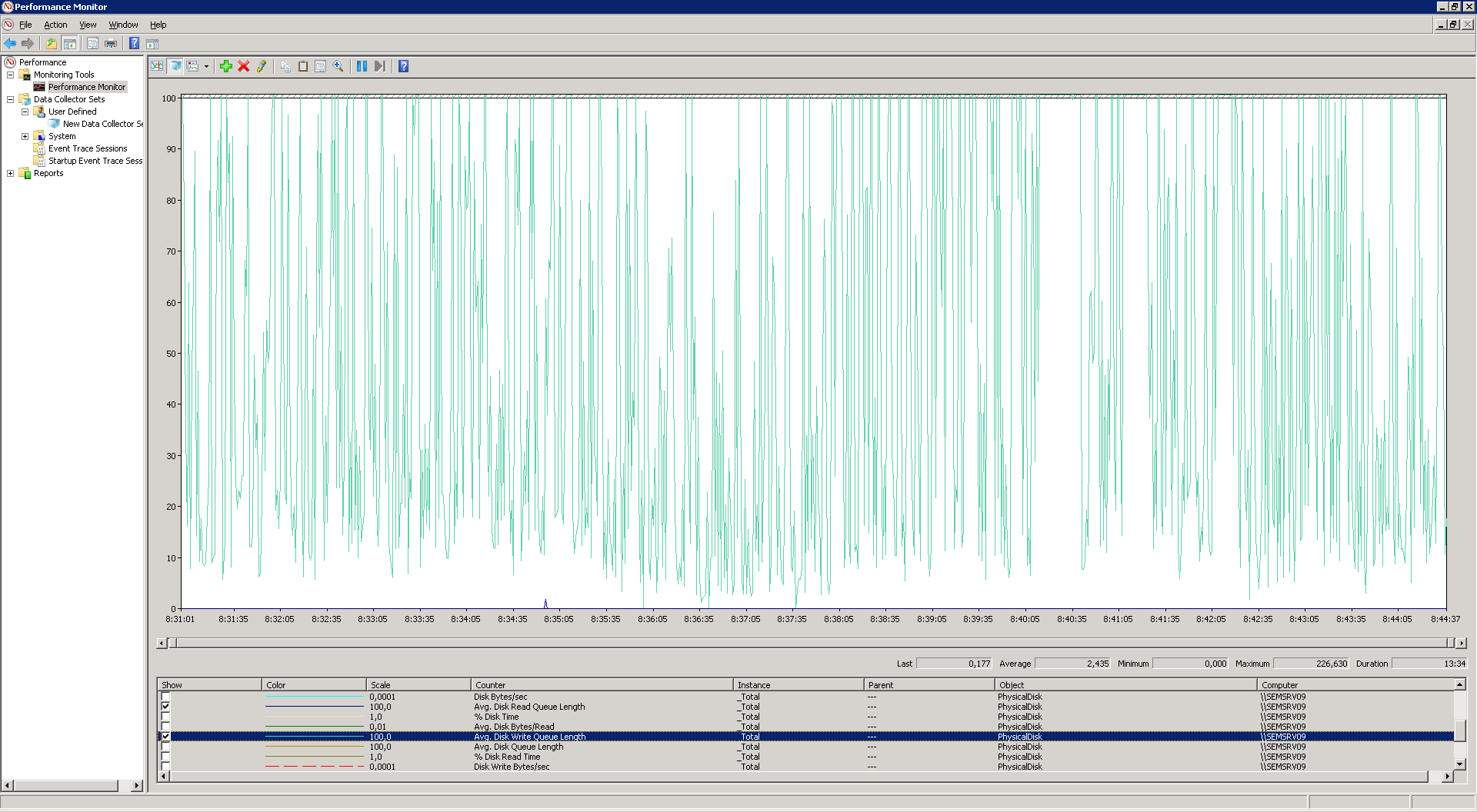 Запустил перфмон на серверах позже приложу отчеты о производительности. Сейчас используем установленные в дисковые подсистемы самих серверов (SAN или NAS - нет).
