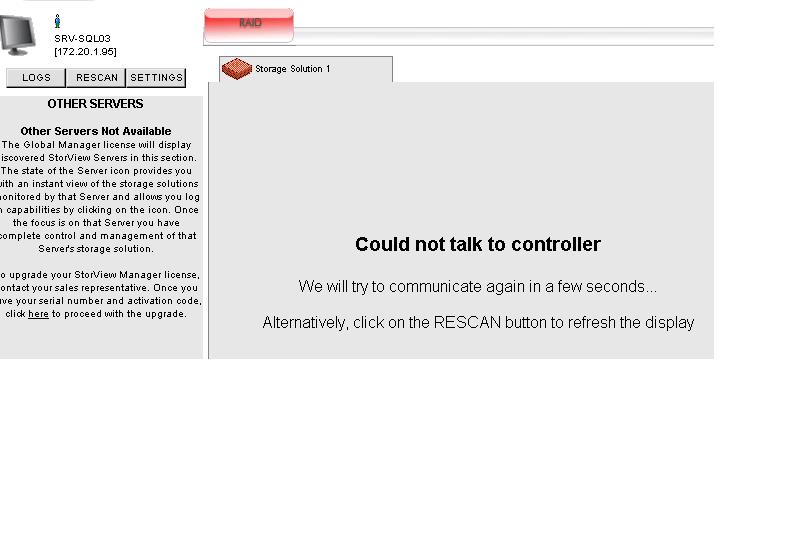 подцепил массив к другому серверу. Там стоит не W2003 а W2008R2. Storview manager 3.10, который работал на старом сервере работать не захотел - в нетстате не было порта 9292. Скачал с ftp.xyratex.com 3.22. Он заработал и показал массив. При удалении LD начались лаги - при запуске менеджера я могу присоединится к контролеру, а затем через минуту мне выдают сообщение "manager could not talk to controller". Это лечится нажатием на кнопку rescan но хватает тоже на минуту. Если на главной странице зайти в какой либо пункт меню и в ИЕ откроется дополнительное окошко - то оно функционально. Но главная страница через минуту начинает моргать красным. спасибо. ПС: написал Куликову Дмитрию, но от него ответа пока нет, ящик ваш.
