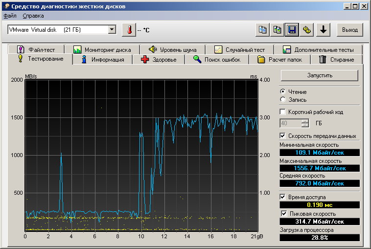 Вчера создал хранилище со страйпом 1024 (мыслил т.к. vmfs 1 mb). Запустил тест HDTune. Увидил безумно рваный график от 200 до 2000 mb/s средняя была 1500 . Померил IOPS в случ. тесте 512б и 4 кб были больше 15 000.