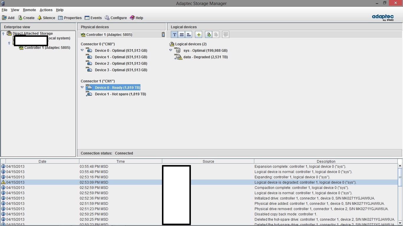 Вечером увидав систему без изменений, решил свободный диск (device 0) сделать выделенным hot span для обоих логических дисков (так как "sys" все также находился в деградированном состоянии). Ребилд не пошел сразу, решил подождать до утра. Утром наблюдаю картину - на device 0 пошел ребилд лог. диска "sys". Процесс пошел только через 4 часа после создания hot span (может связано может нет, и то только после background check). В финале процесса по идеи выйдет не очень оптимальная конфигурация - два диска