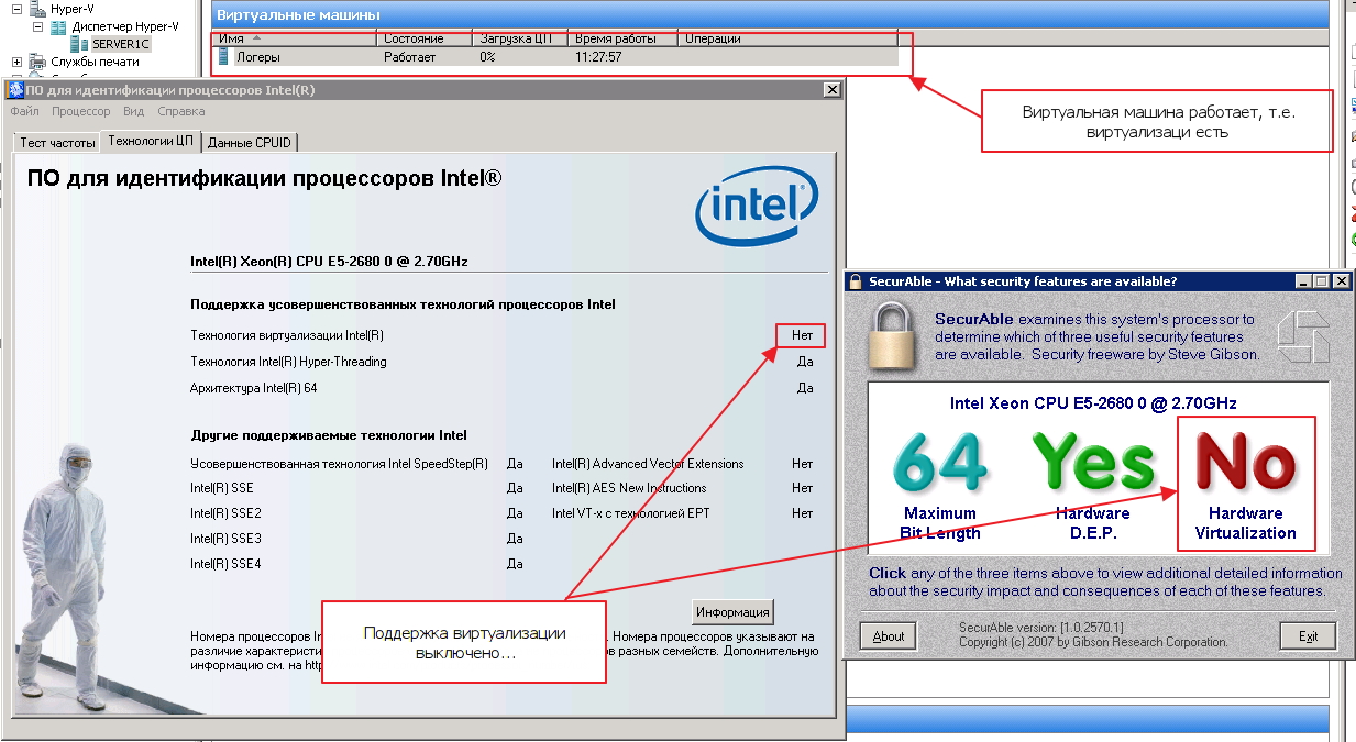 Да еще что обнаружил. ВЫКЛЮЧИВ виртуализацию securable показывает в пункте виртуализации YES, и примечание, что виртуализации обнаружена, но ее нужно включить в биосе, включаю - показывает NO.