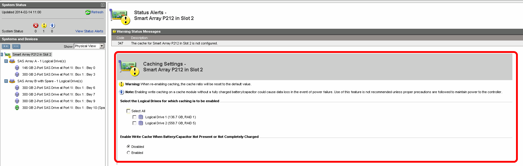 и сразу же получил предупреждение (восклицательный знак) - 347 The cache for Smart Array P212 in Slot 2 is not configured.