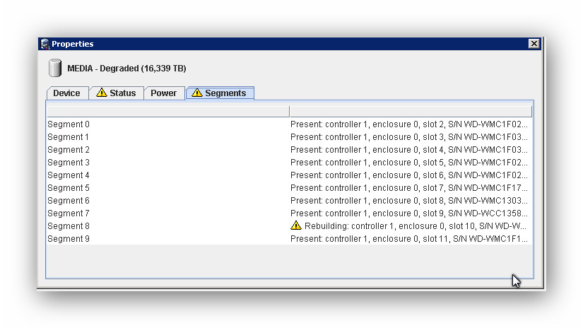 Соответственно один массив RAID5 из 10 дисков выпал в Degraded.