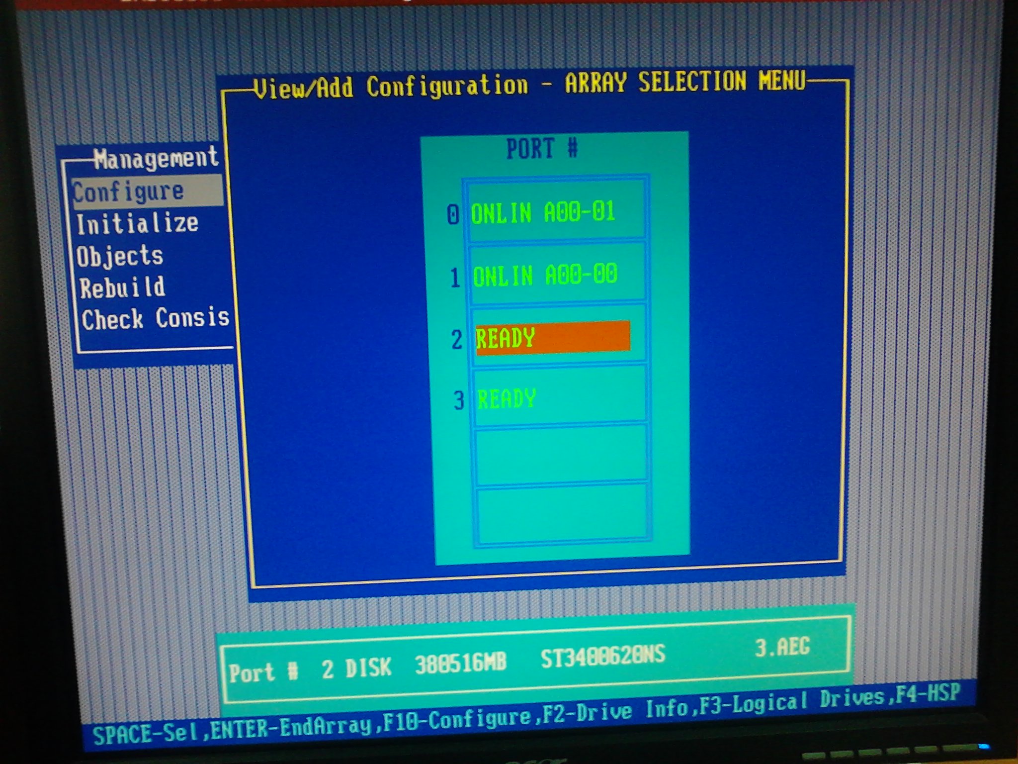 отключили штейкера одного массива (саты выташили пару) что бы подключить сидюк, после того как сидюк убрали и подключили винты, контроллер массив то увидил но вот отдавать его как рабочий онлайн отказался, необходимо сделать процедуру включения или иницуиализации или ребудлта, вот только какую :( давным давно на угад как то попал в такой ситуации,а сейчас диски с инфой не хочется рисковать, прикладываю фоты менюшки раида, подскажите кто помнит или знает , как надругих контроллерах это делается ?