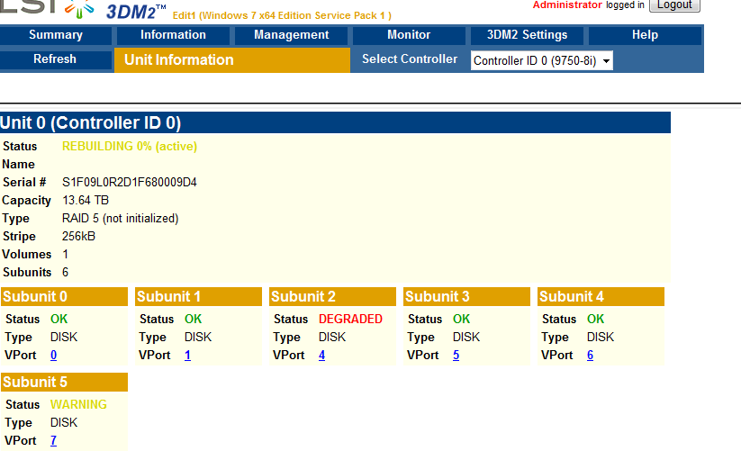 Полез в 3DM2 утилиту - показывает массив DEGRADED, unit #2 is missing. Ребут - то же самое, меняю винт в слоте #2 на девственно чистый - выдает все то же про юнит 2, и в добавок еще и юнит 4, но юнит 4 видит как раз свободный диск который вставил новый.