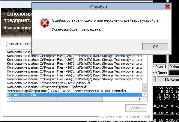 Имеется сервер с системной платой X9DRD-iF, с чипсетом Intel C602и ОС Windows Server 2012R2 Core. Настроен RAID массив в встроенном контроллере. Не получается установить Rapid storage technology enterprise, во время установки вылазит следующая ошибка: После того, как я нажимаю Да, начинается установка и в ходе вылазит следующая ошибка: Пробовал на другом сервере, где тот же чипсет с ОС, тоже самое. Что может быть? Может ему каких то компонентов не хватает???