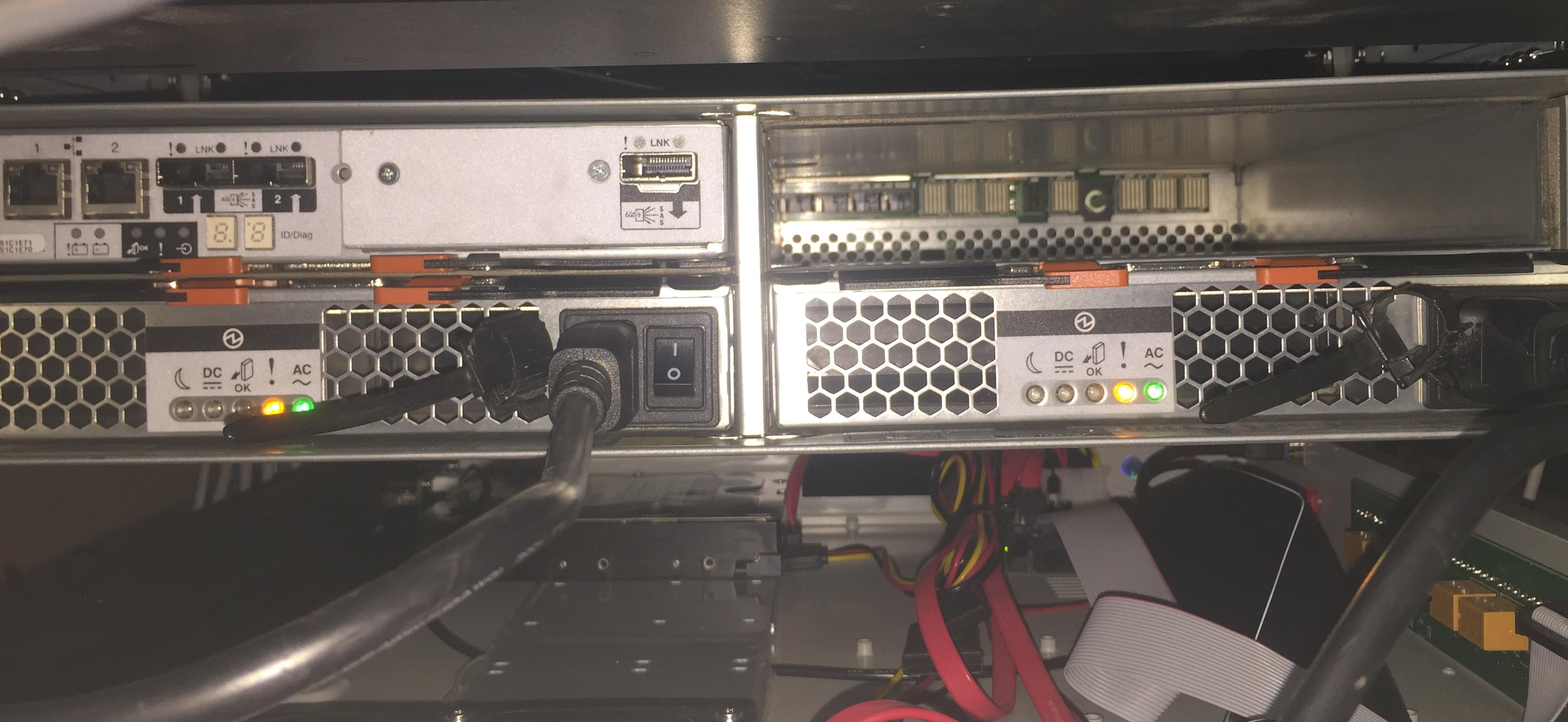 При подачи питания горит индикация только на блоках питания (на обоих) AC и восклицательный знак, сам контроллер без индикации, на передней стороне СХД тоже нет индикации. При передергивании питания, на долю секунды, моргает DC (синим цветом) И сразу тухнет.