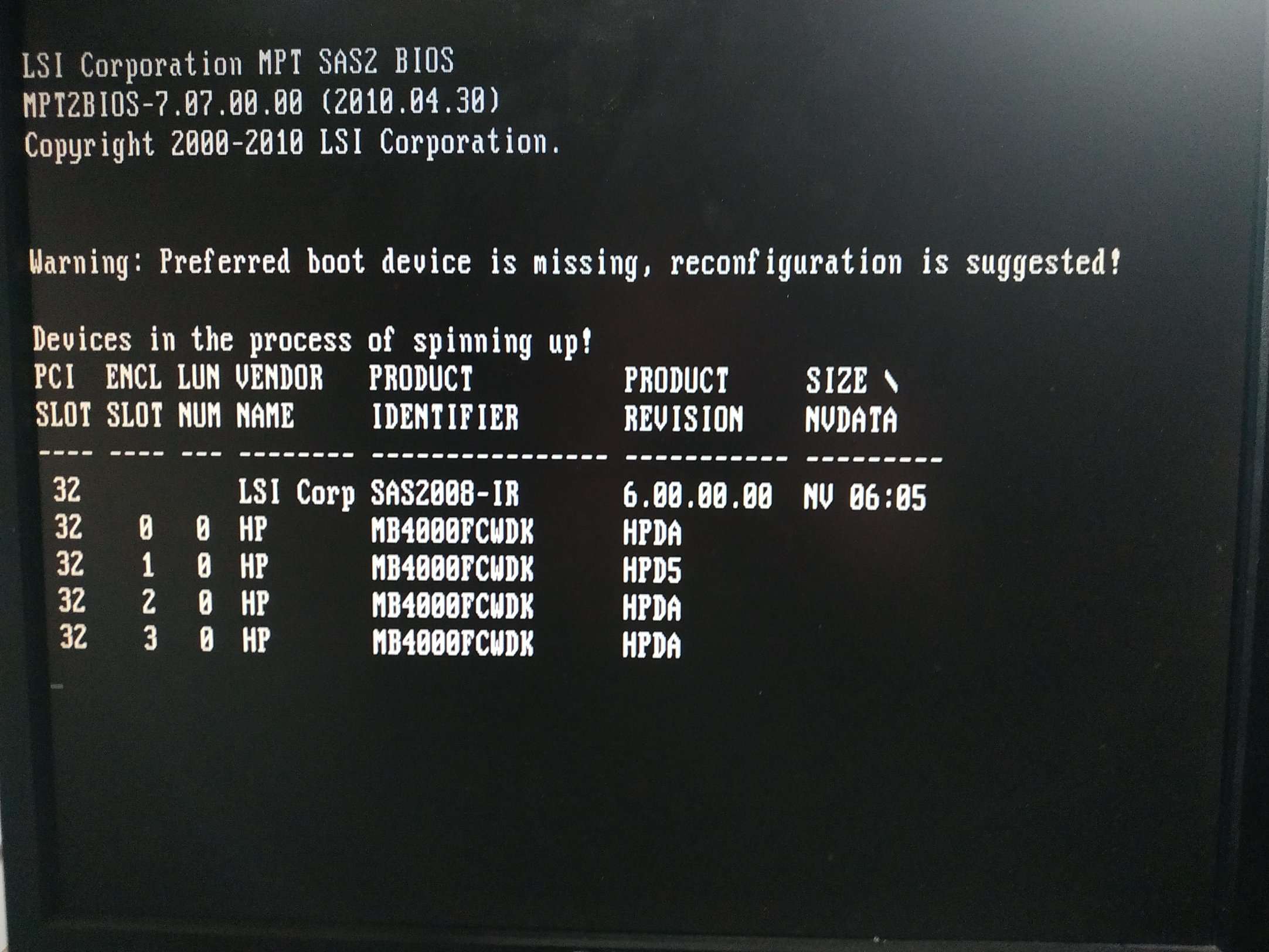 при включении сервер не грузится, а контроллер ругается "devices in the process of spinning up".