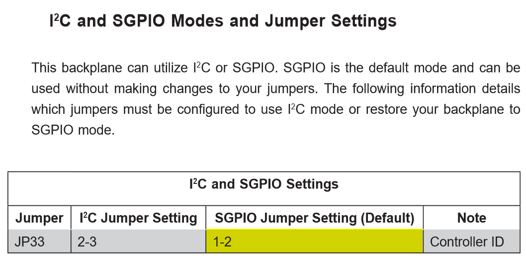 2. Контроллер подключен к BPN к 2 портам Sideband, jumper I2C/SGPIO пробовал в обеих конфигурациях: 1-2 (SGPIO), 2-3 (I2C)