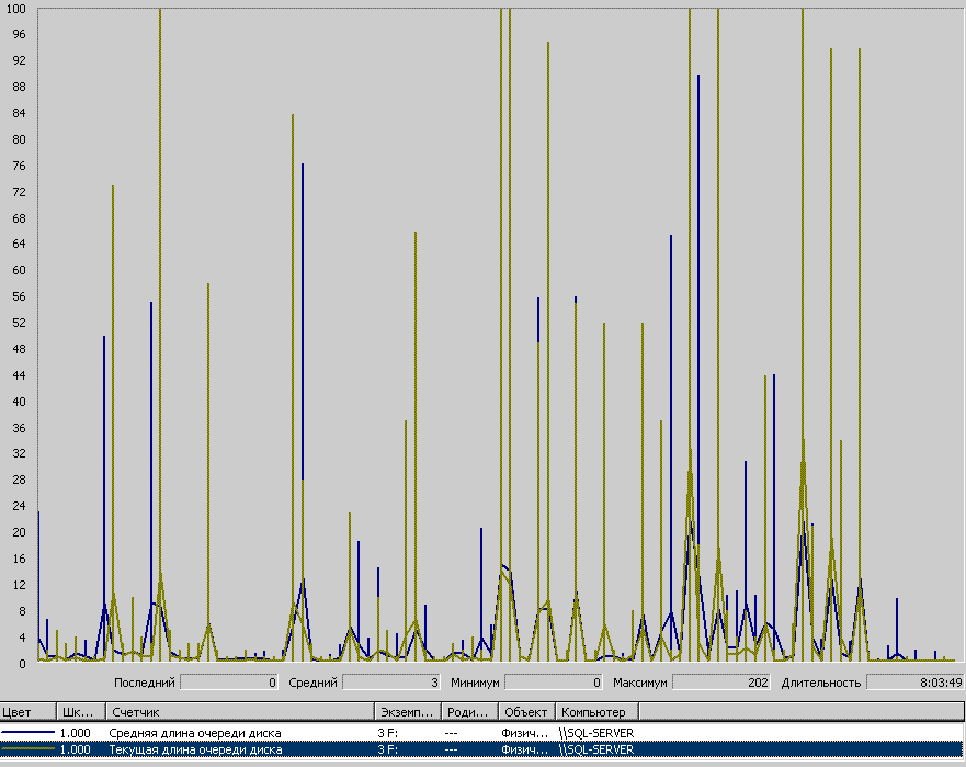 На диске е - логиgs писал(а):Как это ни странно, но с дисковой вроде все в порядке. На всякий случай вложите плиз и другим масштабом - очень плохо видно. Большие пики фиг с ними, а вот что в среднем - хотелось бы рассмотреть подробнее. Просто если очередь в десятки единиц - это уже плохо, а в таком масштабе не видно.