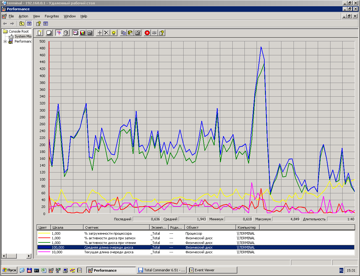Дело в том что наши "толстые отчеты" жрут больше ЦП а не HDDглавное чтобы они были довольны. Попробуйте еще во времяы работы юзеров запустить какой-нибудь толстый отчет и посмотрите в их милые лица снова (ну и на перфмон тоже конечно).