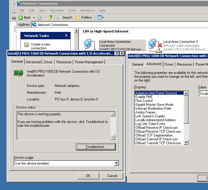 Имеется сервер на мат плате Intel S5000PAL, на данной плате есть 2 сетевых адаптера Intel PRO/1000 EB. Сервер выполняет роль сервера терминалов. На сервере стоит Windows Server 2003 Enterprice SP2. В данный момент к свичу подключен только один из этих сетевых адаптеров. Необходимо настроить на этом сервере технологию Intel - Адаптивное распределение сетевой нагрузки (ALB), задействовав второй сетевой адаптер. Об этой технологии подробнее написано тут