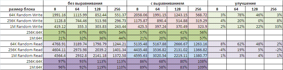Эффект от выравнивания имеется, и особенно заметен на блоке 64К.