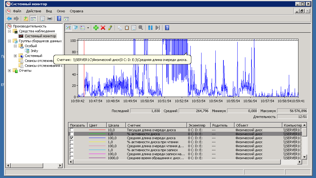 диск 1F это вторая пара дисков в raid1 для сетевых бэкапов...вижу там когда ночью копии с других серваков по сети лезут, тоже очередь идёт прилично? вернее вообще горизон по 100 идёт. по графику видно когда я пусканул проводку в 1с, в 23-40 примерно, через 13 минут она распределила данные и с полуночи 1эска 5 минут проводила и записывала это распределение.
