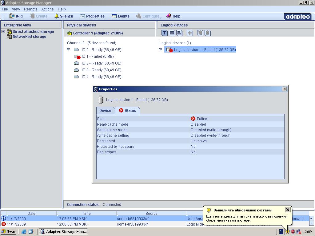 Re: Raid-10 на adaptec 2130s Logical device 1 - failed
